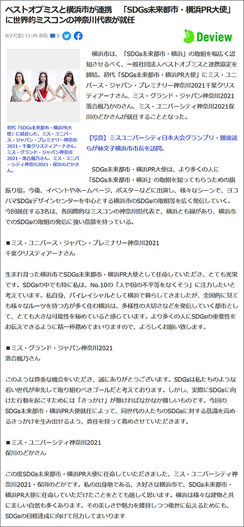 ベストオブミスと横浜市が連携し、「SDGs未来都市・横浜PR大使」に世界的ミスコンの神奈川代表が就任しました。