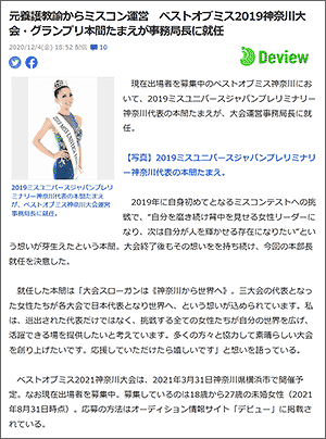 ベストオブミス神奈川において、2019ミスユニバースジャパンプレリミナリー神奈川代表の本間たまえさんが、大会運営事務局長に就任しました。 |