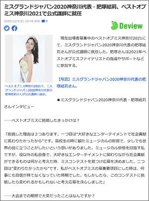 現在出場者募集中のベストオブミス神奈川2021にて、ミスグランドジャパン2020神奈川代表の肥塚結莉さんが公式講師に就任しました。 肥塚さんは2021年ベストオブミスファイナリストの指導やサポートなどに参加します。 |
